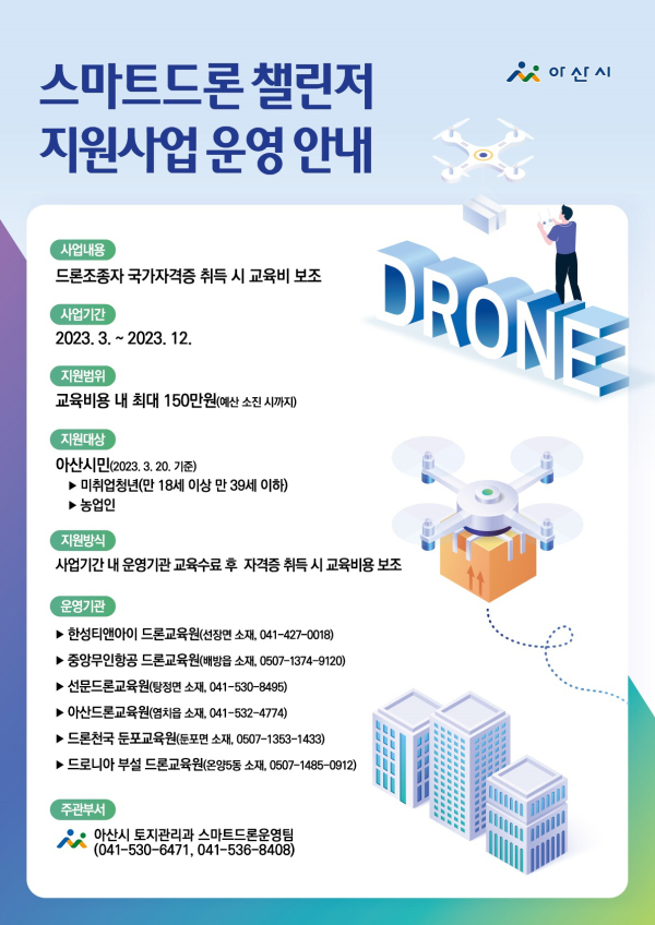 [충청뉴스 박동혁 기자] 충남 아산시는 드론 자격증 취득에 도전하는 미취업청년과 농업인에게 교육비를 지원하는 ‘스마트드론 챌린저 지원사업’을 연중 운영한다고 3일 밝혔다.