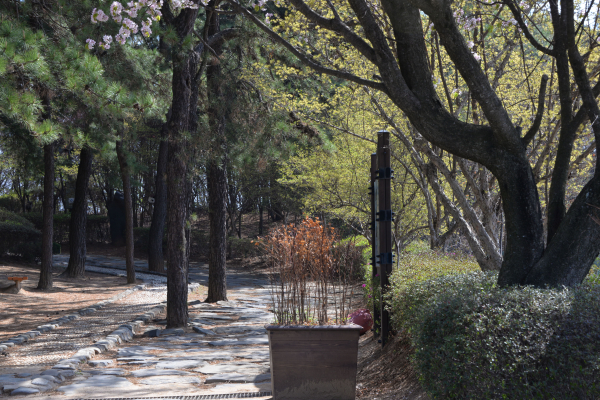 주차장에서 등산로 초입에 진입한다. 초입부터 등산로는 내내 부드러운 황톳길로 이어진다. 울창한 소나무 숲을 마주한다. 상쾌한 솔향기 가득 느껴진다. 이곳 평상이나 정자에서 잠시 쉬면서 몸을 풀고 산행을 시작해도 좋다. 자갈이 박혀 있는 ‘맨발등산지압로’에 눈길이 간다. 이런 지압로는 등산로 중간에 2군데 더 설치되어 있다. 맨발로 이곳을 걸으면 지압 효과가 높다고 한다. 신발을 벗고 한번 맨발로 걸어보자. 가끔씩 맨발로 산행하는 등산객을 만난다.