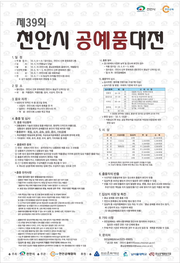 출품 분야는 도자, 목칠, 금속, 섬유, 종이, 기타공예품 6개 분야다. 전통공예의 기술과 조형성을 바탕으로 현대적 디자인과 아름다움이 있으면서, 천안의 멋과 향을 느낄 수 있는 공예품으로 본인이 직접 제작한 작품이어야 한다.