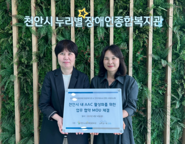 [충청뉴스 최형순 기자] 천안시누리별장애인종합복지관(관장 허성희)과 언어치료AAC센터 사람과 소통(대표 한선경)은 14일 천안시 내 AAC 활성화를 위한 업무협약을 체결하였다.