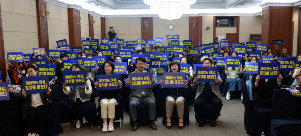 이어 참석자들은 ‘깨어있는 여성이 정치를 바꾼다’, ‘2024 총선승리’ 피켓을 들고 세리머니를 펼쳤다.