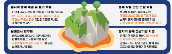 ‘섬 발전 촉진법’에 섬 지역 통계 개념 및 정의와 통계 작성 관련 조항을 포함하고, 실태조사 의무화로 행정자료만으로 파악하기 힘든 부분을 보완했다.