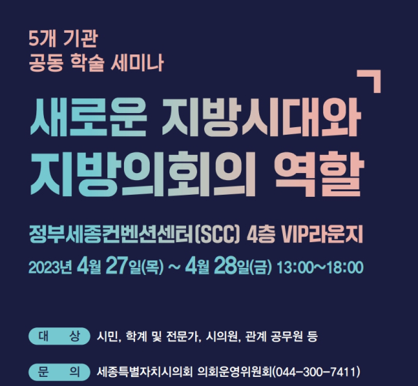 [충청뉴스 최형순 기자] 세종특별자치시의회(의장 상병헌)가 오는 27일부터 28일까지 양일간 정부세종컨벤션센터 4층 VIP 라운지에서 ‘새로운 지방시대와 지방의회의 역할’이라는 주제로 학술 세미나를 개최한다.