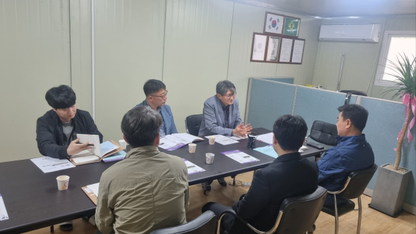 현장 사무소를 방문한 시 관계자는 다른 지역에 비해 아산시의 지역건설업체 참여율이 저조해 지역업체가 어려움을 겪고 있음을 설명했다.
