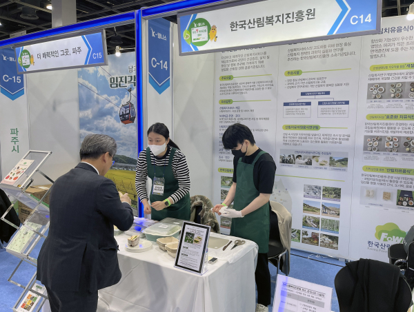 26일 서울 서초구 양재동 aT센터 제1전시장에서 열린 ‘K-웰니스&투어리즘 페어’ 한국산림복지진흥원 홍보부스에서 진흥원 직원이 방문객에게 산림치유음식(사과강정, 인삼유과) 개발과정과 상품을 설명하고 있다.