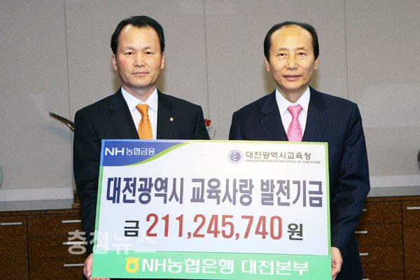 대전시교육청(교육감 김신호)은 7일 농협은행 대전영업본부(본부장 김석태)로 부터 대전교육사랑카드 적립기금 2억1천1백만원을 전달받았다. 이는 지난해보다 7천6백여만원이 증가한 금액이다.