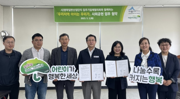 이날 협약식은 명학산단 입주기업체협의회장을 비롯해 관리소장, 초록우산 어린이재단 세종지역본부장, 세종후원회장 등이 참석한 가운데 진행되었다.
