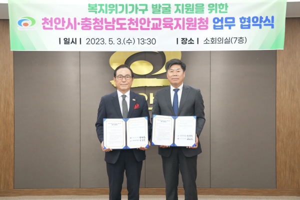 [충청뉴스 박동혁 기자] 충남 천안시는 3일 시청 소회의실에서 충청남도천안교육지원청과 ‘복지사각지대 위기가구 발굴·지원을 위한 업무협약’을 체결했다.
