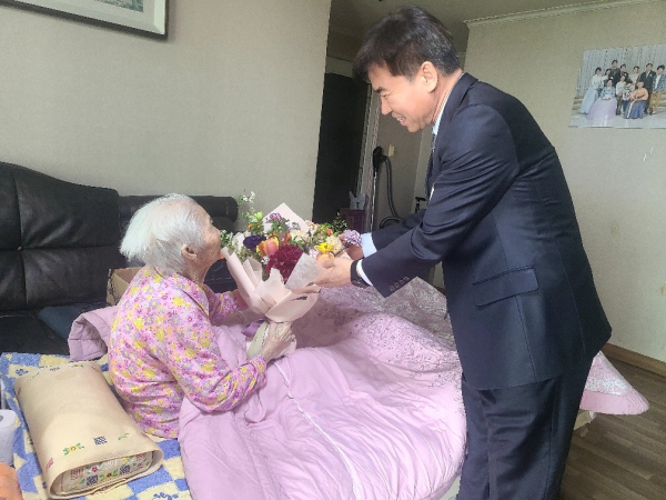 조일교 아산시 부시장은 지난 3일 온양1동에 거주하는 갈복순(여, 100세) 어르신 댁을 방문해 선물을 전달하며 담소를 나눴다.