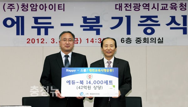 대전시교육청(교육감 김신호)은 9일 오후 대전광역시교육청 6층 중회의실에서 김신호 교육감과 이언구 (주)청암아이티 회장 등 관계자 30여명이 참석한 가운데 42억원 상당의 “에듀-북(Edu-Book) 기증식”을 개최했다고 밝혔다.