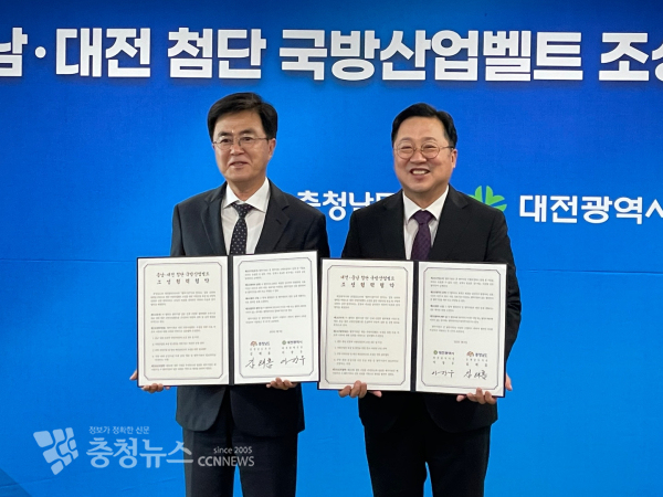 충남도와 대전시는 9일 도청 상황실에서 ‘충남·대전 첨단 국방산업벨트 조성 협력’ 협약을 체결했다.