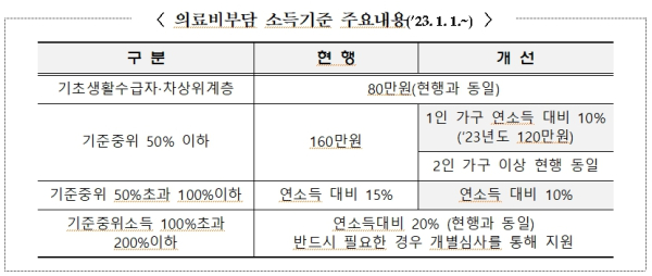 올해 1월에는 저소득층의 지원 대상 및 범위 확대를 위해 의료비 부담 수준* 및 재산 기준**을 완화하는 것으로 개선하였고,
