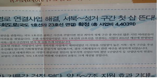 그리고 “번영로 연장사업 예산책정! 김호연이 확정했습니다”라는 내용의 문자메시지를 3월중에 발송했다. 마치 올해 예산이 배정되어서 금년중에 사업이 착공되는 것처럼 홍보했다.