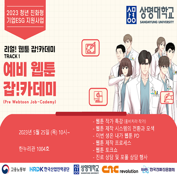 24일 상명대에 따르면 ‘예비 웹툰 잡!카데미’는 고용노동부와 한국산업인력공단에서 지원하는 청년 친화형 기업 ESG 지원 사업에 웹툰 분야의 실전 교육을 하겠다는 목표로 씨앤씨레볼루션(주)와 한국전파진흥협회가 ‘리얼! 웹툰 잡!카데미’로 선정돼 전국 6개 권역 내 10개 기관과 공동으로 개최하는 프로그램이다.