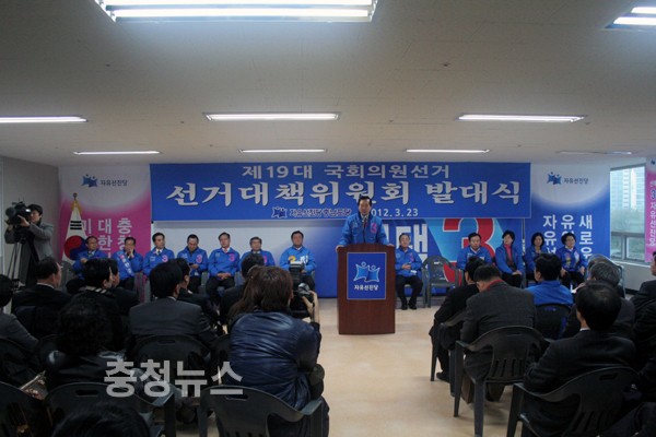 23일 오후 천안 신방동 충남도당 사무실에서 선거대책위원회 출범식에서 심 대표는 "4.11 총선은 어떻게 보면 선진당과 충청의 명운이 걸려있는 선거이기도 하다. 지역, 이념 권력 패권주의에 빠져있는 새누리당과 민주당의 양당 패권정치를 종식시킬 수 있는 유일한 기회가 이번 총선이라고 목소리를 높였다.