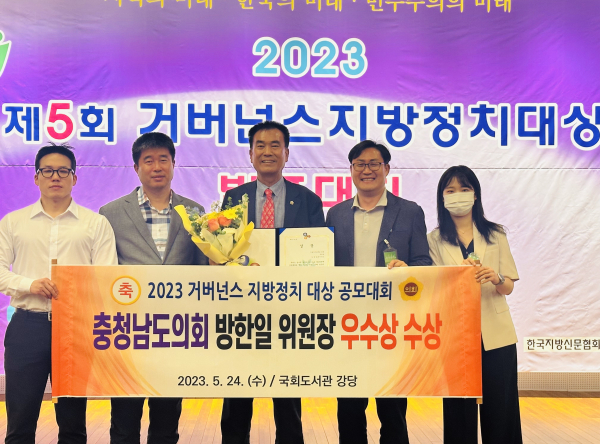 [충청뉴스 권상재 기자] 충남도의회 방한일 의원(예산1·국민의힘)이 24일 국회도서관에서 열린 ‘2023 거버넌스 지방정치대상’ 시상식에서 ‘우수상’을 수상하며 2년 연속 수상의 영예를 안았다.
