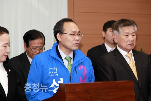 자유선진당 서산·태안 성완종 후보가 26일 충남 서산시청 브리핑실에서 기자회견을 갖고 본격적인 선거전에 돌입했다.