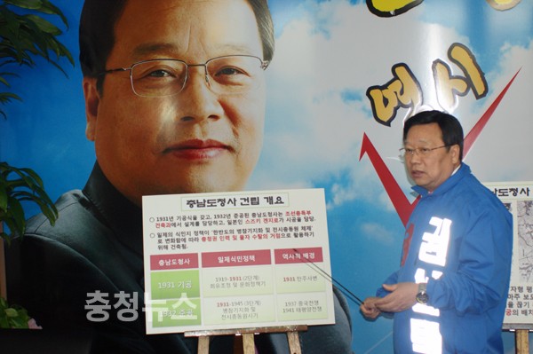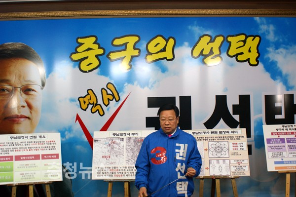 4. 11총선을 16일 앞두고, 각 당 후보자들이 공약발표를 통해 표심잡기에 나선 가운데, 자유선진당 권선택(중구) 후보가 충남도청사 철거 근거와 활용방안에 대해 설명하고 나섰다.