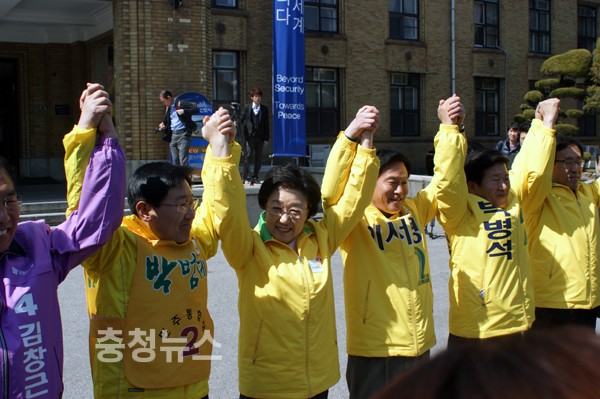 ▲ 충남도청 정문에서 한명숙 대표와 대전지역 후보들이 만세를 외치고 있다.