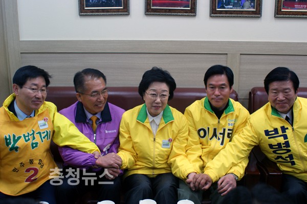 ▲ 한명숙 대표와 대전지역 후보자들이 두손을 꼭잡고 앉아있다.