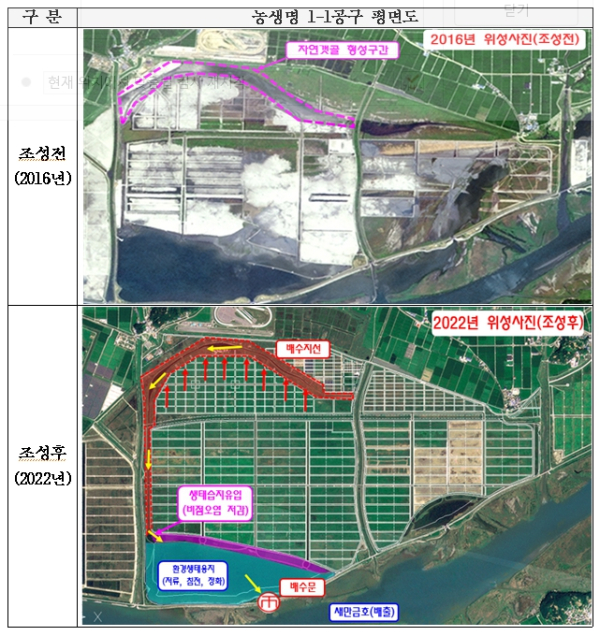 그러면서 "1-1공구 내 배수로는 배수로 등 조성(매립)과정에서 불순물이 섞여 들어간 것이 아니고, 자연적으로 형성된 갯골을 그대로 활용하여 만든 곳으로 준설토로 새로이 조성한 수로가 아니다"라고 설명했다.