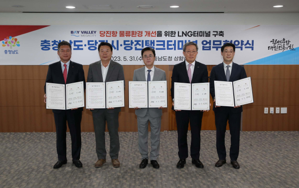 김태흠 지사와 오성환 당진시장은 이날 도청 상황실에서 김준형 당진탱크터미널㈜ 대표, 정탁 포스코인터내셔널 대표, 윤춘성 LX인터내셔널 대표와 액화천연가스 터미널 구축 업무협약을 체결했다.