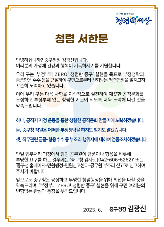 [충청[충청뉴스 김남숙 기자] 대전 중구(구청장 김광신)는 6월 1일부터 10일까지 중구청 누리집을 통해 중구청의 반부패ㆍ청렴실천 의지를 담은‘구청장 청렴 서한문’을 게시한다고 밝혔다.
