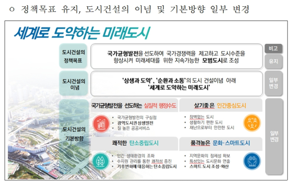 가장 큰 변화는 도시건설의 기본방향을 ‘국가균형발전을 선도하는 실질적 행정수도’로 명시하고, 국가중추시설이 들어서는 환상형 도시구조의 중심부를 ‘국가 입법‧행정‧문화가 어우러지는 열린 공간’이자 국가적 상징 공간으로 조성하기로 한 것이다. 이 지역의 취약한 접근성을 높이기 위해 BRT 차로 신설 등 대중교통을 강화하는 한편, 부족한 도로용량을 개선하기 위한 별도의 연구도 올해 말까지 병행할 계획이다.