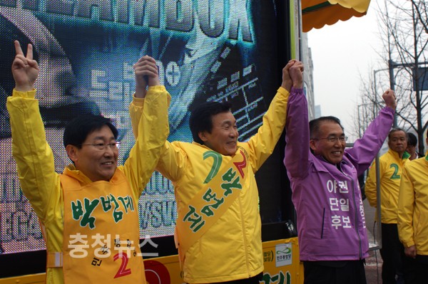 ▲ 민주통합당 박범계 후보와 손학규 전 대표 통합진보당 김창근 후보가 만세를 외치고 있다.