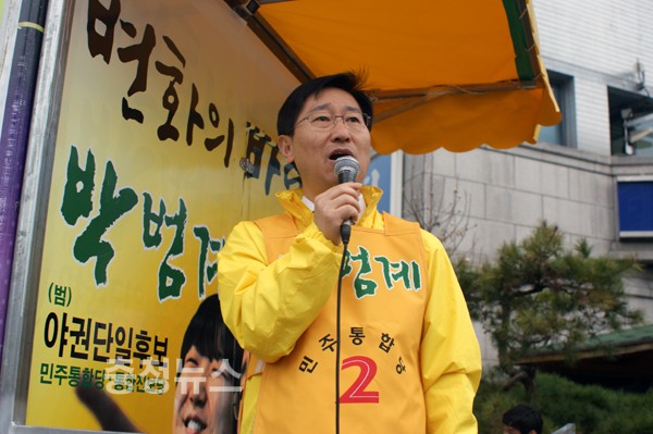 민주통합당 손학규 前 대표가 박범계(서구을) 후보를 지원하기 위해 대전을 방문해 세몰이에 나선 가운데 박범계 후보를 당선 시켜 달라며 지지를 호소하고 나섰다.