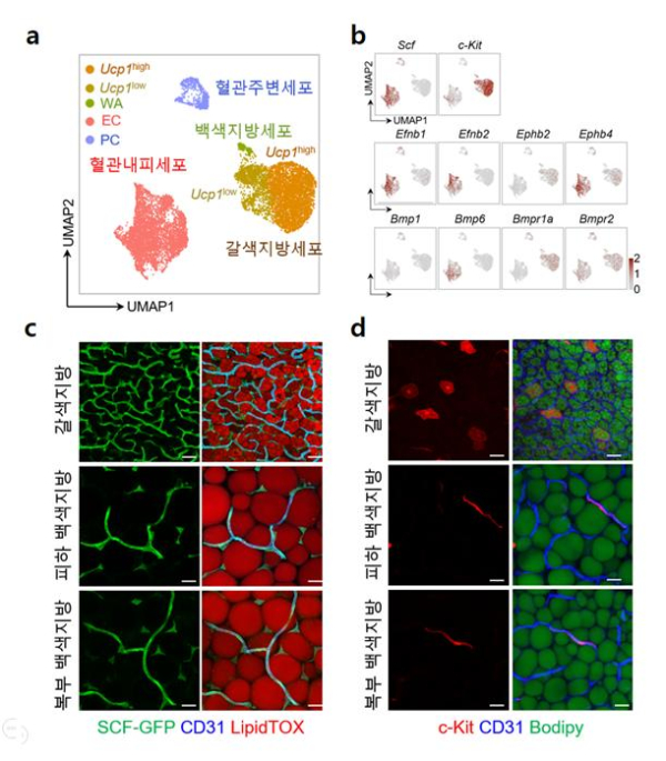 연구진은 단일핵 RNA 시퀀싱 기법으로 갈색지방 내 갈색지방세포, 혈관내피세포 및 주변세포를 각각 분리해 줄기세포성장인자와 시-키트 수용체의 상호작용이 갈색지방세포와 혈관내피세포에서 특이적으로 강하게 발현함을 확인했다. 그리고 면역염색기법으로 줄기세포성장인자와 시-키트 수용체를 각각 표지한 마우스를 이용해 줄기세포성장인자와 시-키트의 상호작용을 확인했다.