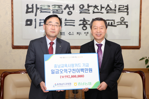 충남교육청(교육감 김종성)은 9일 오전 지난해 ‘충남교육사랑카드’ 사용으로 모아진 기금 5억9200만원을 농협충남지역본부(본부장 임승한)로부터 전달 받았다.