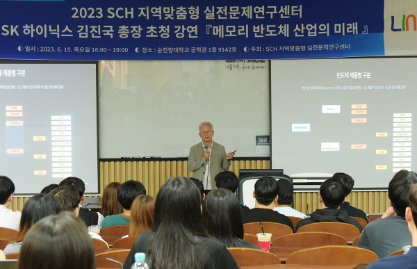 [충청뉴스 박동혁 기자] 순천향대학교는 15일 교내 공학관에서 신산업 전문 인재 양성 및 반도체 산업 현장 지식 함양을 위해 SK하이닉스 사내 대학(이하 SKHU) 김진국 총장을 초청해 특강을 진행했다고 밝혔다.