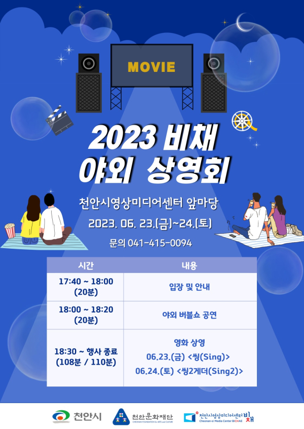 [충청뉴스 박동혁 기자] 천안문화재단은 오는 23~24일 천안미디어센터에서 ‘2023 비채 야외 상영회’를 운영한다고 19일 밝혔다.