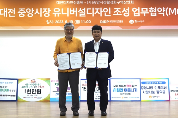 [충청뉴스 김용우 기자] 대전디자인진흥원과 (사)중앙시장활성화구역상인회는 19일 유니버설디자인을 적용한 편의시설 조성을 통해 대전 중앙시장을 비롯한 지역경제의 활성화를 실현하기 위해 적극 협력하고자 업무협약을 체결했다.