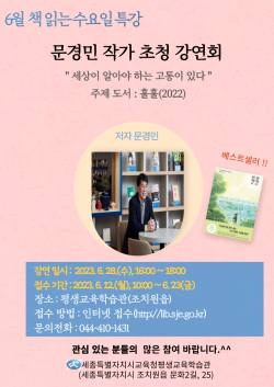 [충청뉴스 최형순 기자] 세종시교육청평생교육학습관은 오는 6월 28일 16시에 문경민 작가를 초청하여 ‘세상이 알아야 하는 고통이 있다’라는 주제로 강연회를 개최한다.