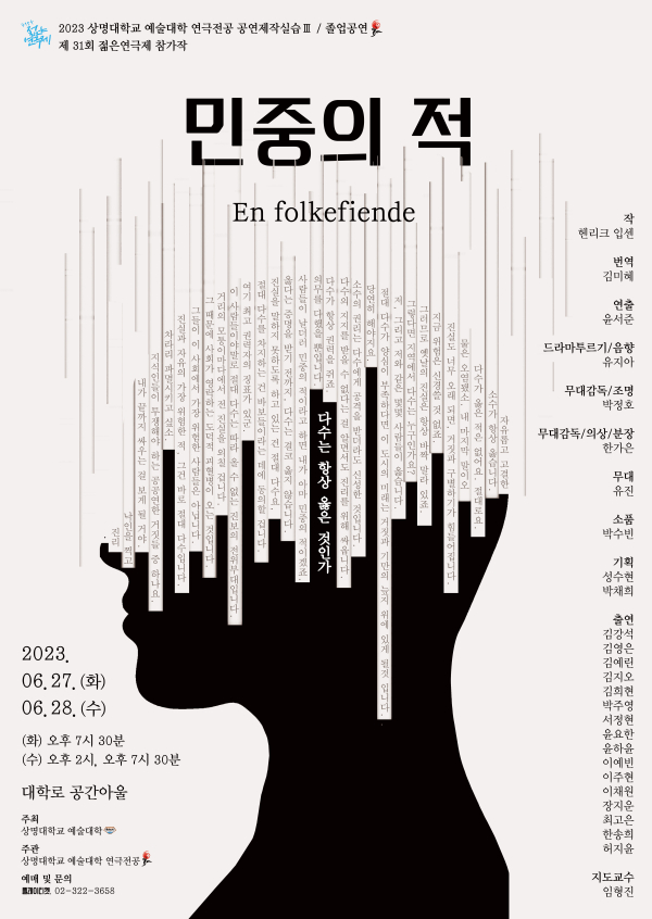 임형진 지도교수는 “‘민중의 적’은 입센의 19세기 사회에 대한 반항적 시선이 투영된 작품”이라며 “오늘날 흔히 목격하는 집단과 개인 사이의 힘과 진실의 모순적 관계 등에 대해 진지하게 생각할 수 있도록 할 것”이라고 말했다.