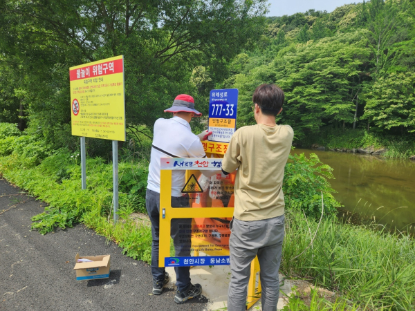 시는 지난 4월부터 물놀이 집중지역인 광덕면 풍서천 일원과 북면 병천천 일원 안전시설물에 대한 일제 점검을 실시해 낡은 안전시설물을 정비하고, 인명구조함과 안전표지판을 8개소에 신규로 설치했다.