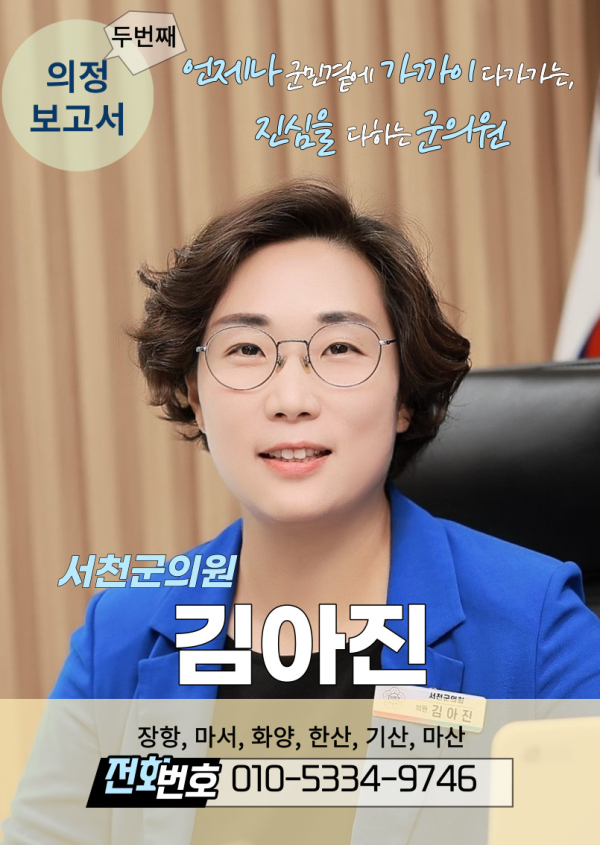 [충청뉴스 서천 = 조홍기 기자] 김아진 서천군의회 부의장이 ‘두번째 의정보고서’를 발간하고, 찾아가는 의정보고를 통해 직접 배포하며, 주민들과 소통의 장을 가질 예정이다.
