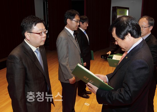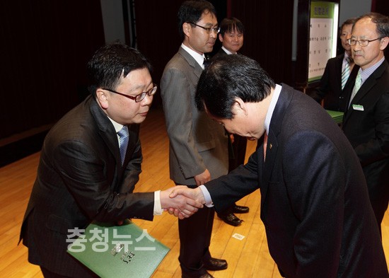 ▲ 디지털타임스 대덕연구단지 출입하는 이준기 기자가 과학의 날 염홍철 대전시장으로 부터 표창을 수여받고 있다