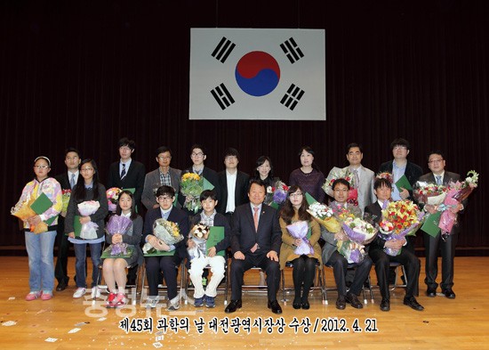 대전광역시(시장 염홍철)은 21일 제45회 과학의 날을 맞아 대덕연구단지내 과학관련 보도 공로자로디지털타임스 대전지사 대덕연구단지 출입하는 이준기 기자를 비롯한 정상전(45) 과학기술연합대학원대학교(UST·총장 이은우)-한국생명공학연구원(KRIBB·원장 정혁) 캠퍼스 나노바이오 공학 교수 등이 염홍철 대전시장으로부터 과학기술진흥 유공자 표창을 받았다.