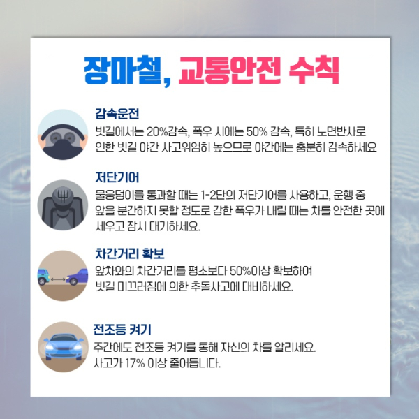 빗길 안전사고 예방을 위한 주의사항으로는 ▲전조등 켜기 ▲타이어, 제동장치, 와이퍼 사전 체크·점검 ▲앞차와의 거리 평소보다 50% 이상 길게 유지 ▲주행 속도 평소보다 20% 감속 운행 등이 있다.
