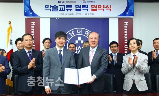 한남대학교(총장 김형태)와 국가핵융합연구소(소장 권 면, 사진 가운데 왼쪽)는 26일(목) 오후 3시 한남대 본관 대회의실에서 양 기관 관계자들이 참석한 가운데 학·연 협약을 체결했다.