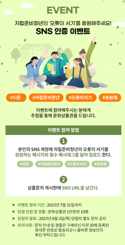 이번 캠페인은 이달 31일까지 진행되며 본인의 SNS(Social Network Service) 계정에 자립준비청년의 오롯이 서기를 응원하는 메시지와 필수 해시태크를 달아 업로드를 하면 추첨을 통해 문화상품권을 제공하는 인증 이벤트도 함께 이뤄진다.