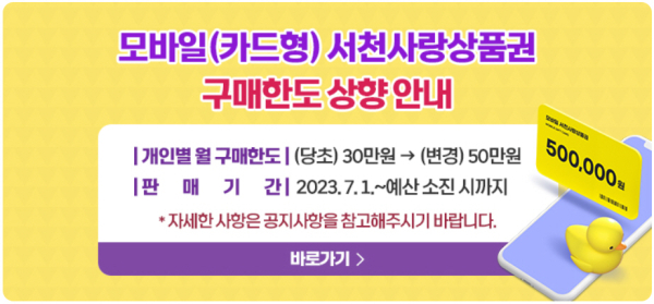 [충청뉴스 서천 = 조홍기 기자] 서천군이 7월부터 모바일 서천사랑상품권의 월 구매 한도를 기존 30만원에서 50만원으로 상향한다고 밝혔다.
