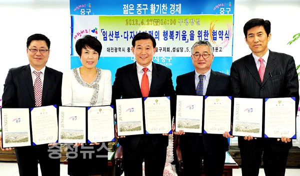 대전 중구(구청장 박용갑)는 지난 27일 아이 낳고 키우는 일이 행복한 세상 만들기 사업 추진의 일환으로 ‘임신부·다자녀가정 행복 키움’ 협약을 체결했다.