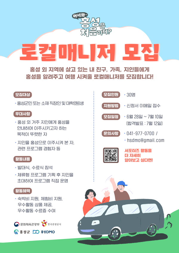 올해 처음 모집하는 ‘어서와 홍성은 처음이지’로컬 매니저는 7월 중순 발대식을 시작으로 약 4개월간 활동하게 된다. 홍성군은 로컬 매니저가 더욱 알찬 홍성 여행 일정을 기획할 수 있도록, 참여 대상에게 다양한 활동 프로그램도 지원할 예정이다.