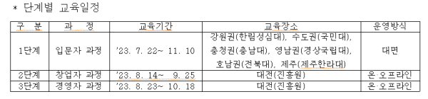 이번 교육과정은 전문업 창업을 희망하는 입문자, 창업자, 경영자 3단계 과정으로 구성하여 온라인과 대면 강의, 멘토링 및 실습의 방식으로 과정별 최대 8주까지 진행한다.