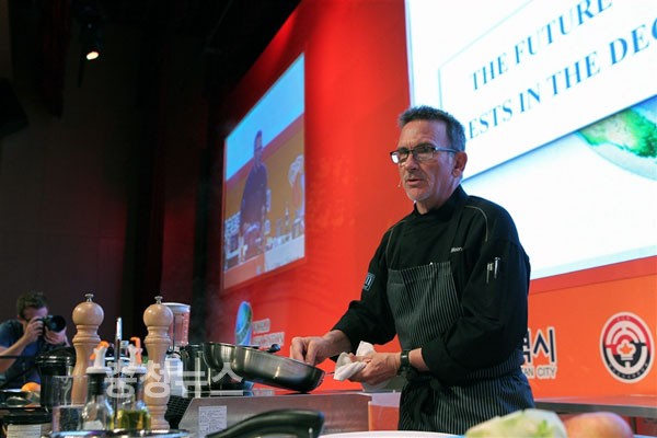 2012대전세계조리사대회가 열리고 있는 대전컨벤션센터 그랜드볼룸에서 3일 오전 8시 WACS총회 프로그램의 일환으로 미국 뉴욕 출신의‘릭 무넨(Rick Moonen)’의 요리 시연이 펼쳐져 참가자들의 눈길을 사로잡았다.