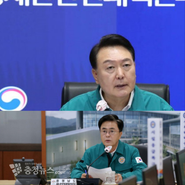 윤석열 대통령은 17일 오전 '집중호우 대처 중앙재난안전대책본부 회의'를 진행했다. 이날 김태흠 충남지사는 청양, 부여, 공주, 논산을 특별재난지역으로 조기 선포될 수 있도록 윤 대통령에게 건의했다.